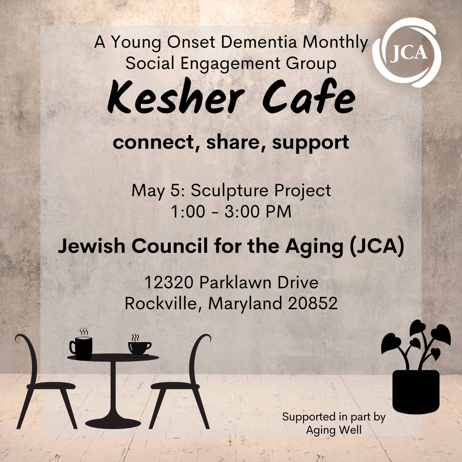Kesher Cafe, a group for those with young onset dementia, continues to offer social engagement. The next meeting will take place on May 5 with an art therapy session and a sculpture project.