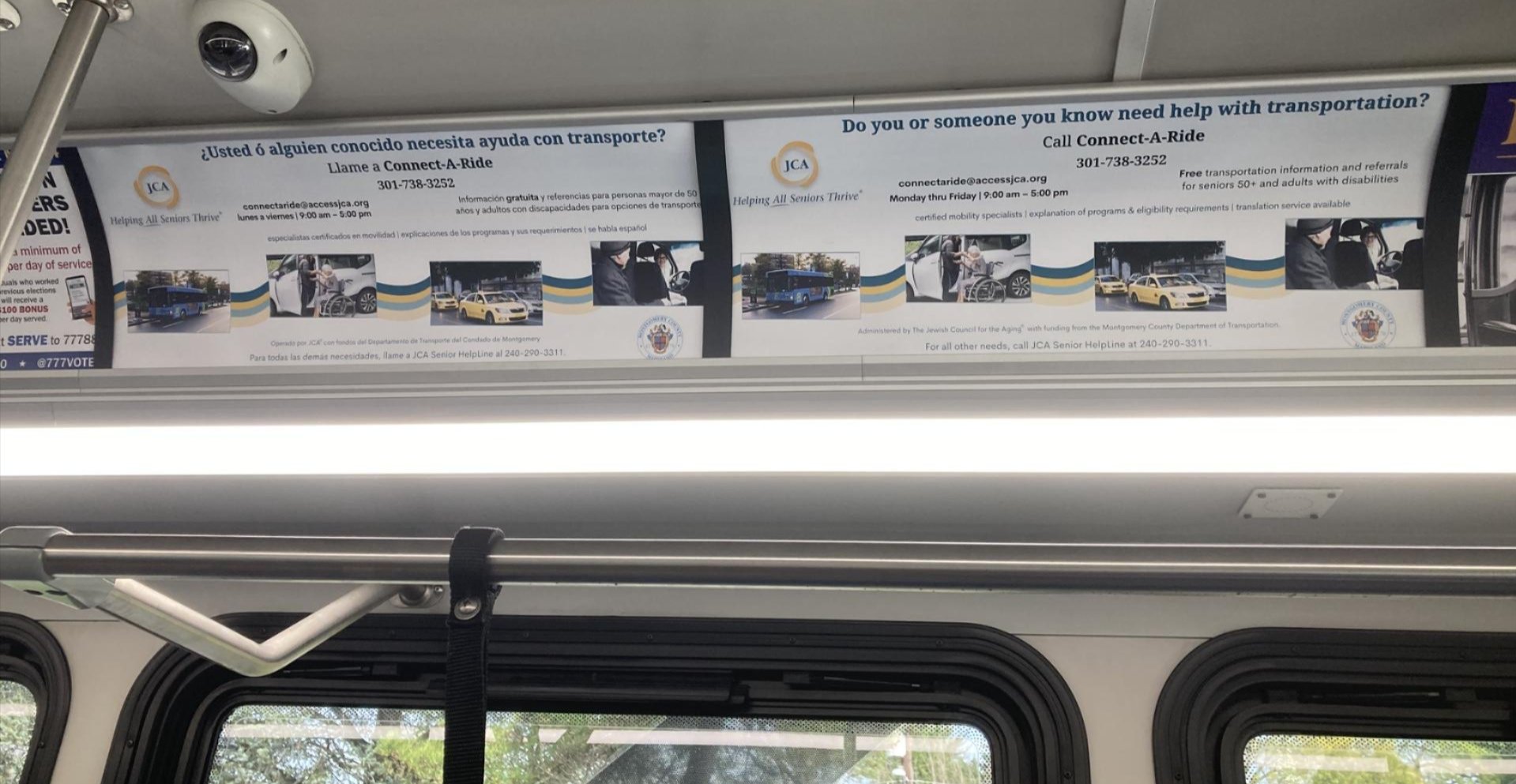 Next time you are on the Ride On bus, look up! You may see the Connect-A-Ride (CAR) ad. The ads that appear in English and Spanish direct passengers to JCA’s CAR services. The transportation program’s Mobility Specialists provide tailored transportation options and help with schedules, benefits, and eligibility requirements.