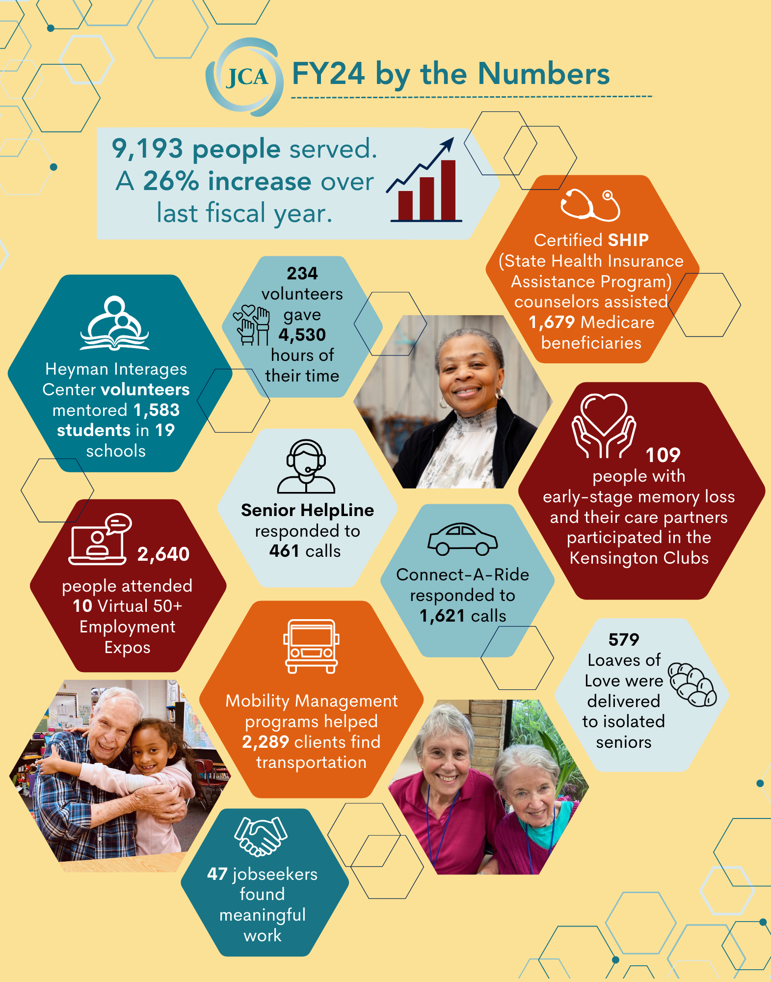 JCA’s outstanding services continue to foster independence, build social connections, and help older adults thrive and age in place. This past year the number of people served reached 9,193. We anticipate we will continue to see increasing demand for JCA’s services this coming year and in the years to come.